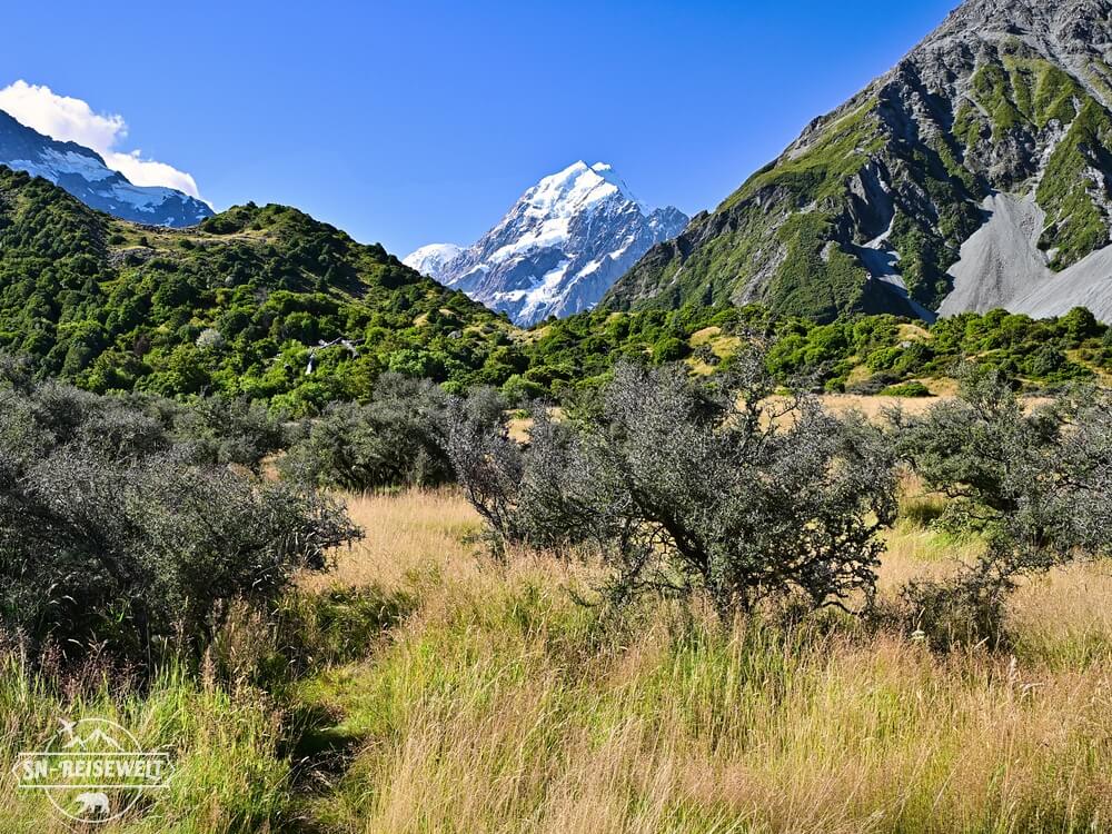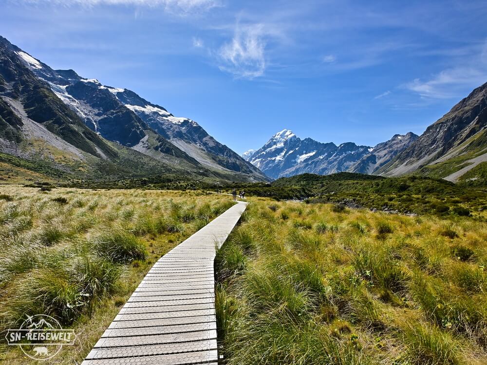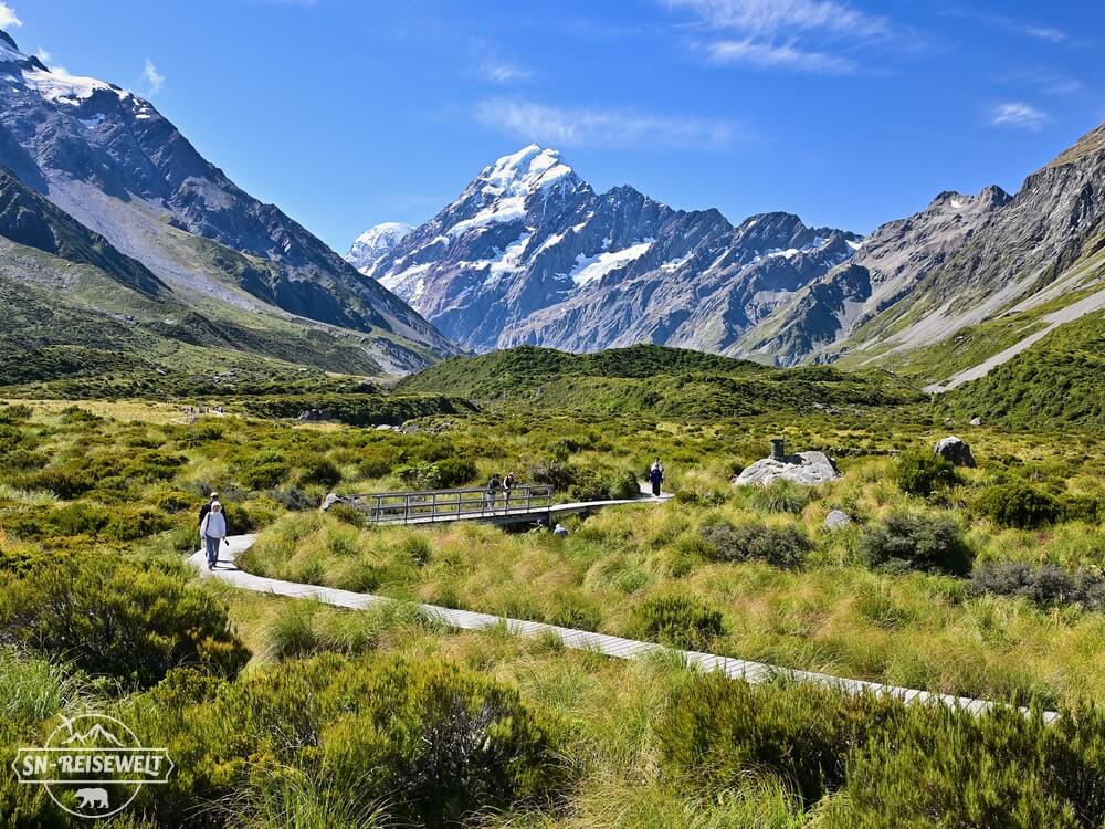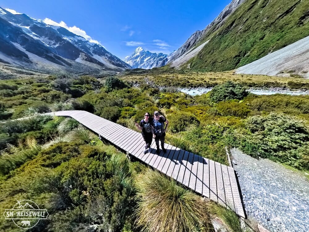 Mit jedem Schritt auf der dritten Brücke wächst die Spannung. Plötzlich steht er da: Aoraki/Mount Cook, frei, mächtig und fast überirdisch schön! Unsere Schritte werden schneller, das Herz klopft lauter. Wir können es kaum fassen, wie nah er wirkt – ein unvergesslicher Augenblick vor dem höchsten Gipfel Neuseelands.