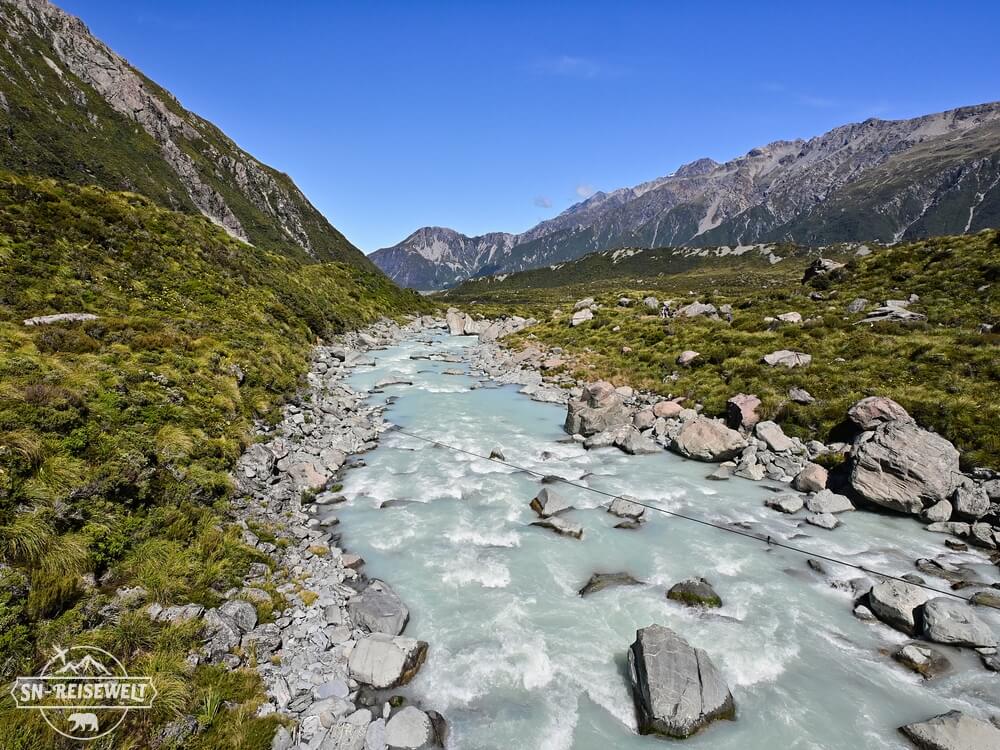 Wir folgen dem Pfad weiter durchs Tal, stets begleitet vom Rauschen des Flusses. Der Weg führt uns immer wieder über Holzplanken durch alpine Flora, sumpfige oder empfindliche Vegetationszonen. Diese Abschnitte zählen zu den fotogensten des gesamten Trails. An der zweiten Hängebrücke angekommen, hält uns die überwältigende Aussicht den Atem an: Das donnernde Gletscherwasser, umrahmt von schroffen Bergen, ist ein echter Wow-Moment! Wir genießen die imposante Aussicht auf den Hooker River, der durch das imposante Tal rauscht.