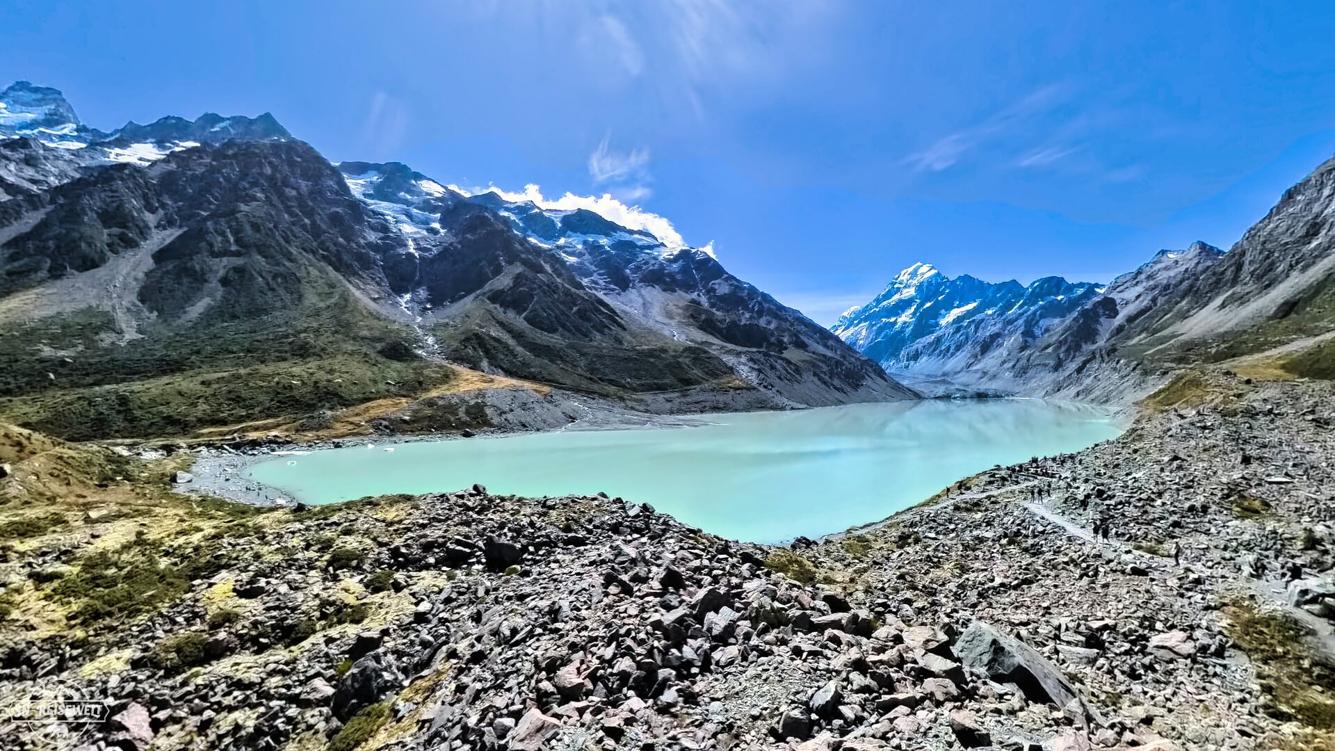 Ein letzter Anstieg – und dann liegt er vor uns: der Hooker Lake. Türkisgrau und still, gespickt mit kleinen Eisbrocken, die auf der Wasseroberfläche treiben. Über ihm erhebt sich die gewaltige Gletscherwand des Mount Cook. Wir setzen uns, lassen die Rucksäcke sinken, packen unser Picknick aus – und sind einfach nur da. Kein Foto, kein Video kann diesen Moment festhalten. Die Stille, die Weite, das Gefühl von Freiheit – das ist pures Neuseeland. Und wir mittendrin.