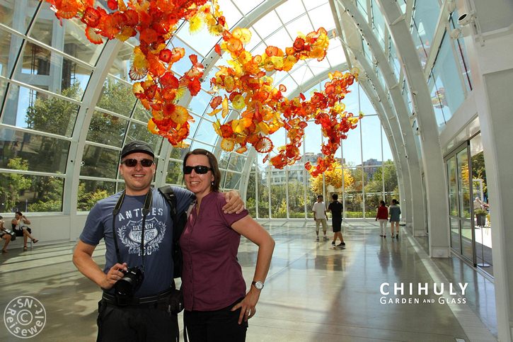 Nach der Stärkung folgt ein Besuch der Chihuly Garden and Glass Ausstellung, die sich unmittelbar neben der Space Needle auf dem Gelände des Seattle Center befindet. Die Eintrittskarten dafür haben wir bereits am Vortag gekauft. Kombiniert mit dem Besuch der Space Needle hat uns der Spaß 33 Dollar pro Person gekostet. Normalerweise reizen uns Kunstaustellungen nicht, diese ist aber absolut sehenswert. Untermalt von Musik führt am Eingang des Gebäudes ein Gang durch abgedunkelte Räume zu den kreativen Glaskunstwerken. Gezeigt werden Glasskulpturen des Künstlers Dale Chihuly, die man in dieser Form und Menge nur hier sehen kann. Unglaublich, was hier alles aus Glas entstanden ist. Es gibt verschiedene Bereiche, die man durchläuft. Ein Raum wird von dem nächsten getoppt. Diese Glaskunst haben wir bisher nur an der Decke der Lobby des Bellagio Hotel in Las Vegas bewundern können.