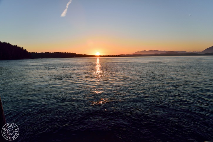 Am Abend ist es Zeit für einen Spaziergang bei Sonnenuntergang am Hafen. Ein perfekter Ort dafür ist ein Bootssteg direkt vor dem Anleger der Tofino Air Lines. Hier draußen ist es nicht immer still. Von weiten hören wir das Brummen von Propellermaschinen, die sogenannten Airtaxis. Vor Eintritt der Dunkelheit kommen sie zurück zur Basis. Das kräftige Abendlicht lässt die Landschaft in warmen Farben erleuchten. Plötzlich ist es im Hafen still geworden, bevor die Sonne endgültig am Horizont untergeht. Allein der Anblick auf die umliegenden Berge und Regenwälder am Clayoquot Sound ist einnehmend. Nach dem Sonnenuntergang knurrt uns der Magen. In der Nähe unserer Unterkunft bietet sich das Shelter Restaurant an, das ebenfalls an der Hauptstraße liegt. Nach den vielen Steak- und Lachsspeisen der letzten Tage gönnen wir uns heute Abend eine leckere Shelter Pizza. Diese ist mit frischen Zutaten zubereitet und ist sehr schmackhaft. Absolut zu empfehlen!